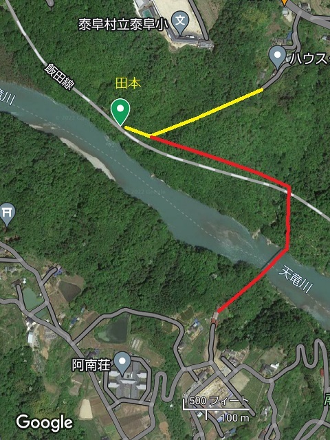 山の上への獣道の他に、天竜川を吊橋で渡って阿南町側へ出る方法