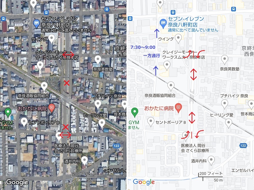近鉄奈良駅方向からおかたに病院へ行く場合、元々は西側の踏切
