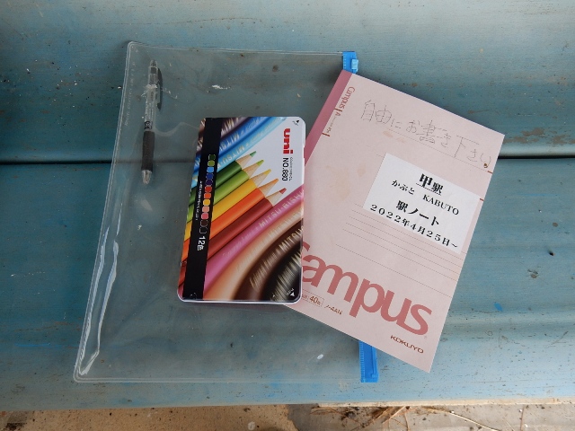 駅ノートは手前の待合室にありました。ボールペンの他に色鉛筆