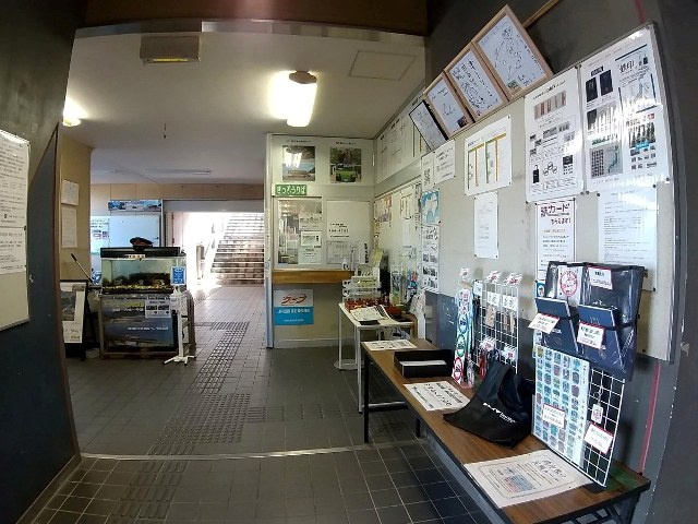 駅舎に入ると出札口と改札口があり、同社のグッズが多く売られて