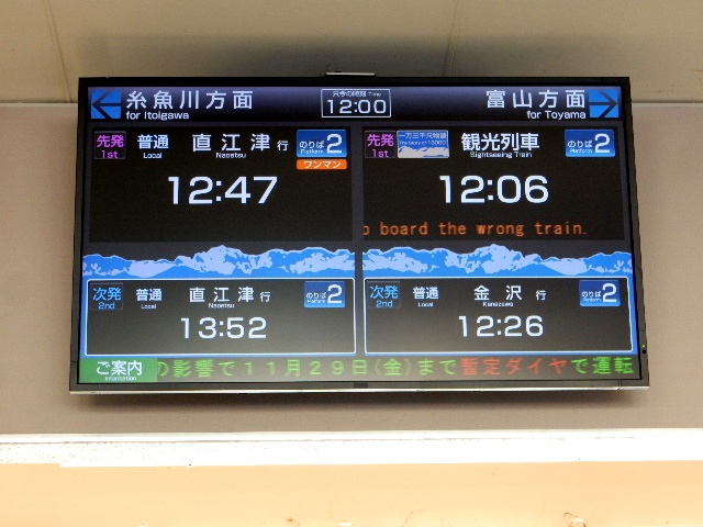 発車案内は大型のモニターなので、立山連峰をイメージしたような