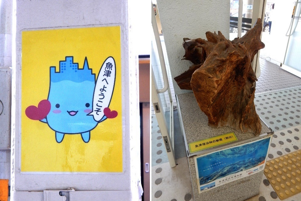 駅に貼られた絵は魚津市のゆるキャラ、「ミラたん」。