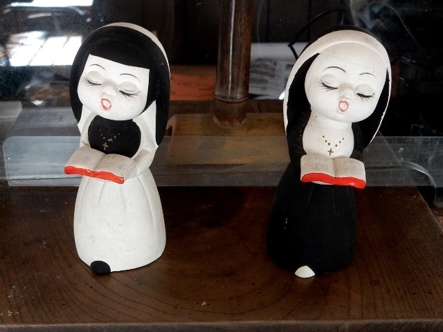 ② 出札カウンターにあった、謎のシスター(修道女)の置き物。