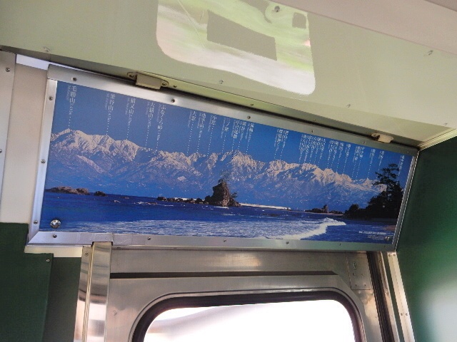 車内の扉上には、立山連峰の山並みを解説した写真があります。