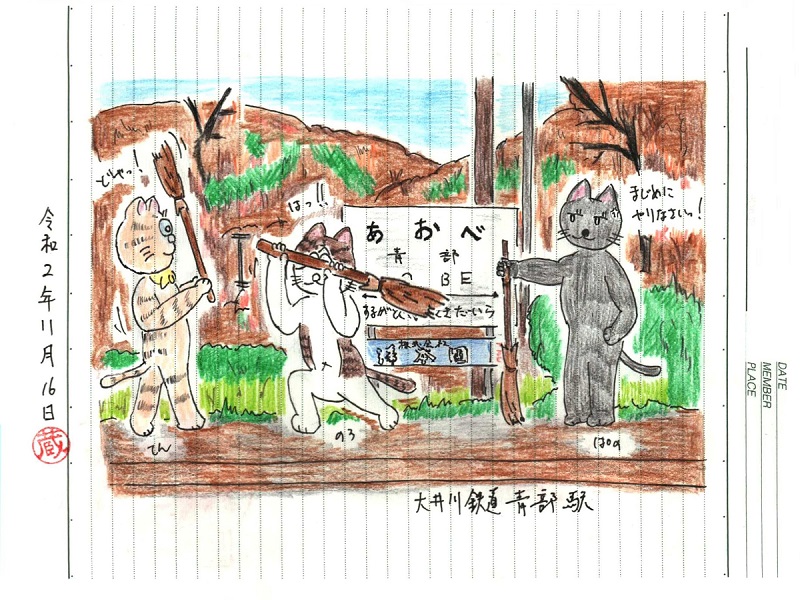 駅の掃除に来た事にしておきましょう。秋で落ち葉が多い季節だし。