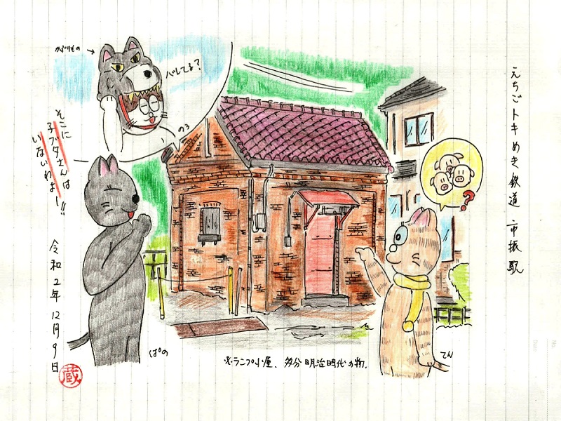 駅舎の外観は左の感じです。隣の親不知から続く奇岩の地形をネタ