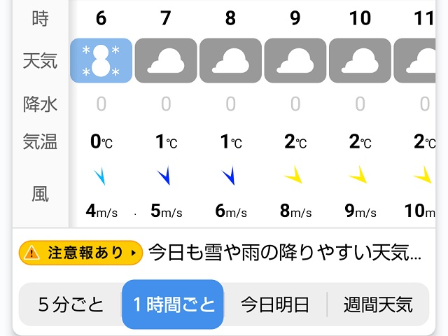 この時点で唐津市の天気予報を見たら右の感じです。雪は朝までに