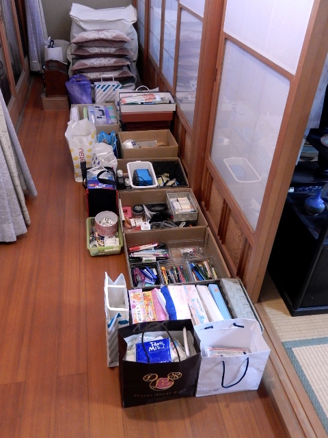 な仏間側の廊下に仮置きしました。物置部屋を完全に片付けたら