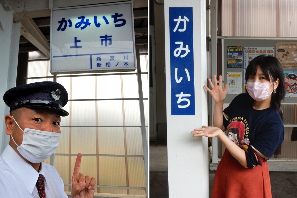 駅名票を入れた自撮りと社長のフリー撮影と、縦位置の写真が並び