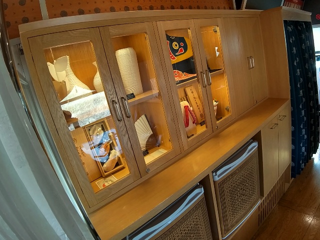 木を基調とした和風のインテリアと謎のアニマルっぽい柄のシートと、