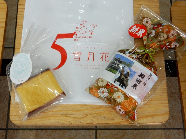 最後にお土産として、カステラのようなお菓子と御当地のお米を少し