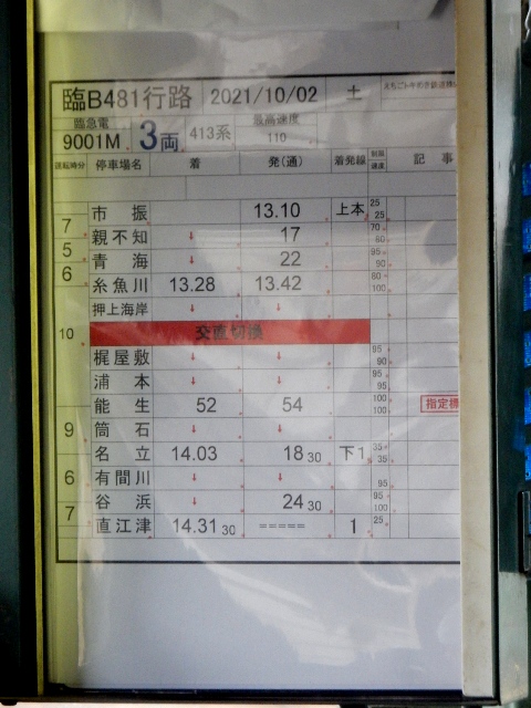 そして掲載のナイ停車駅として能生で2分、名立で15分と設定して