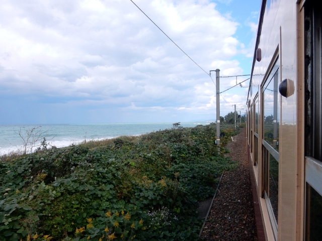 列車は親不知付近の海岸線に沿って走ります。「国鉄情緒」と言う