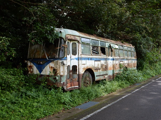 途中の山道に、遺棄されたバスがありました。…年式不明古い物