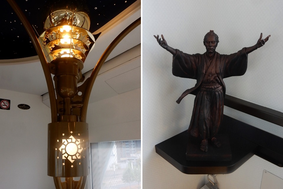 そして車室の端っこに、小ぶりながら坂本龍馬の銅像がありました。