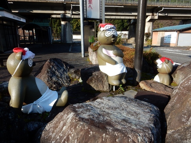…同駅の駅前には露天風呂に入ってるタヌキさんの人形が飾られ