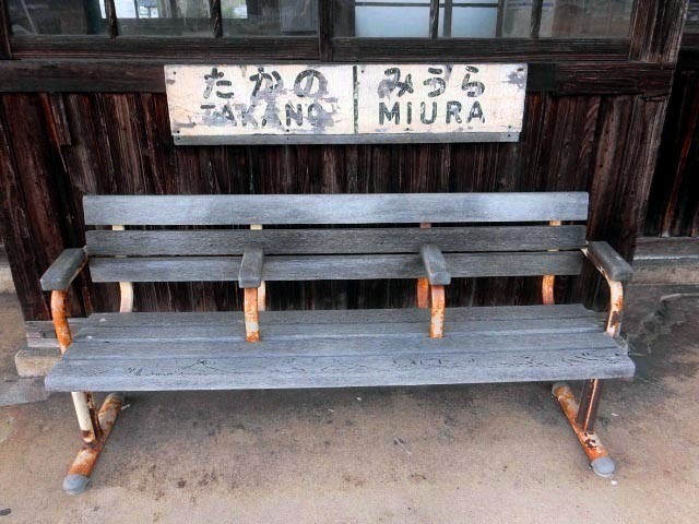 木製のベンチと他であまり見ないような個性的な駅名票があります。