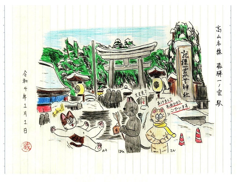 としては水無神社の初詣の様子を描く事にしました。