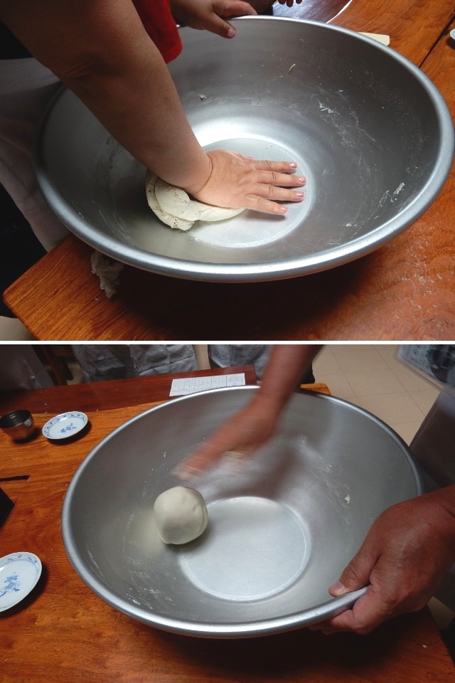 まずはそば粉に規定量の水を入れ、混ぜて捏ねて…の繰り返しです。