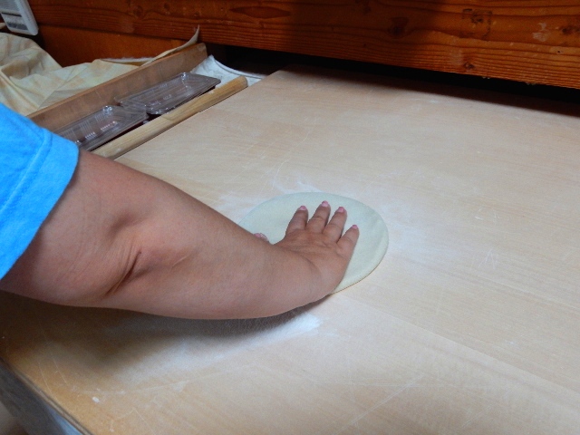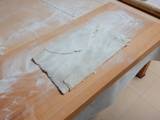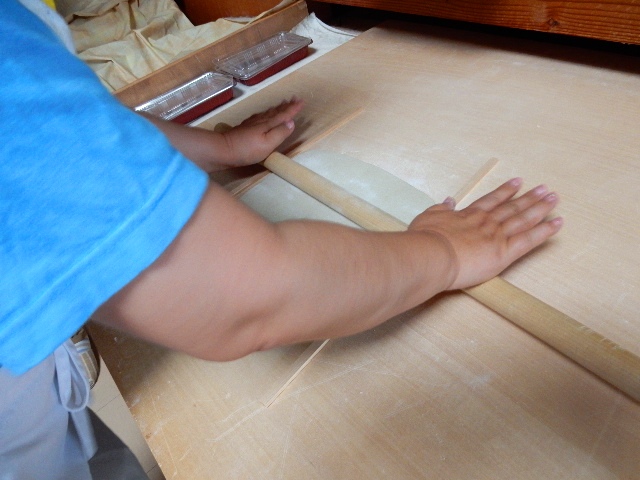伸ばした生地は折りたたんで、いよいよ切る準備に入ります。