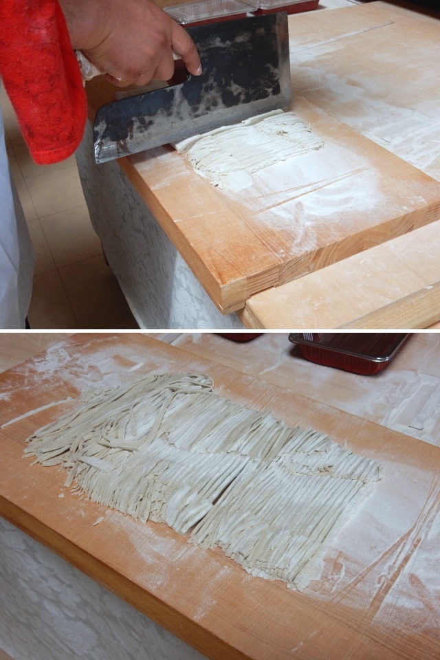 初めて見たような巨大な包丁で生地を切ります。