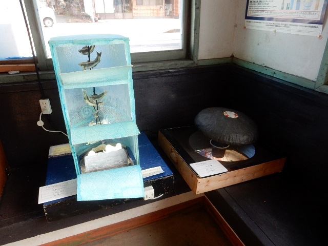真四角なコンクリートの待合室に竹筒を着色した物や簡素な作りの