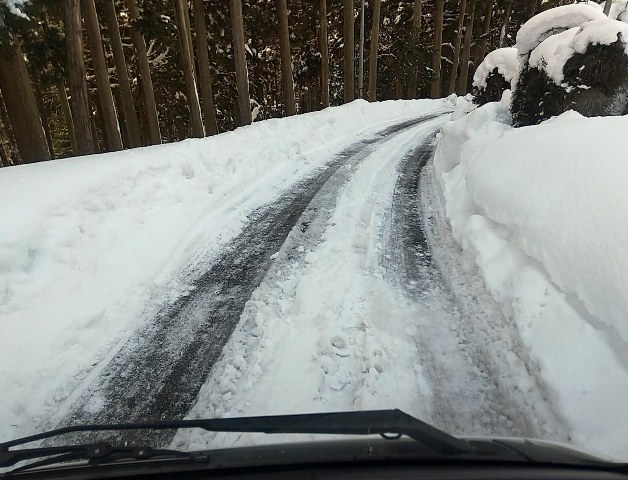 …ココ数日の大雪で国道から外れた脇道は完全に凍ってました。