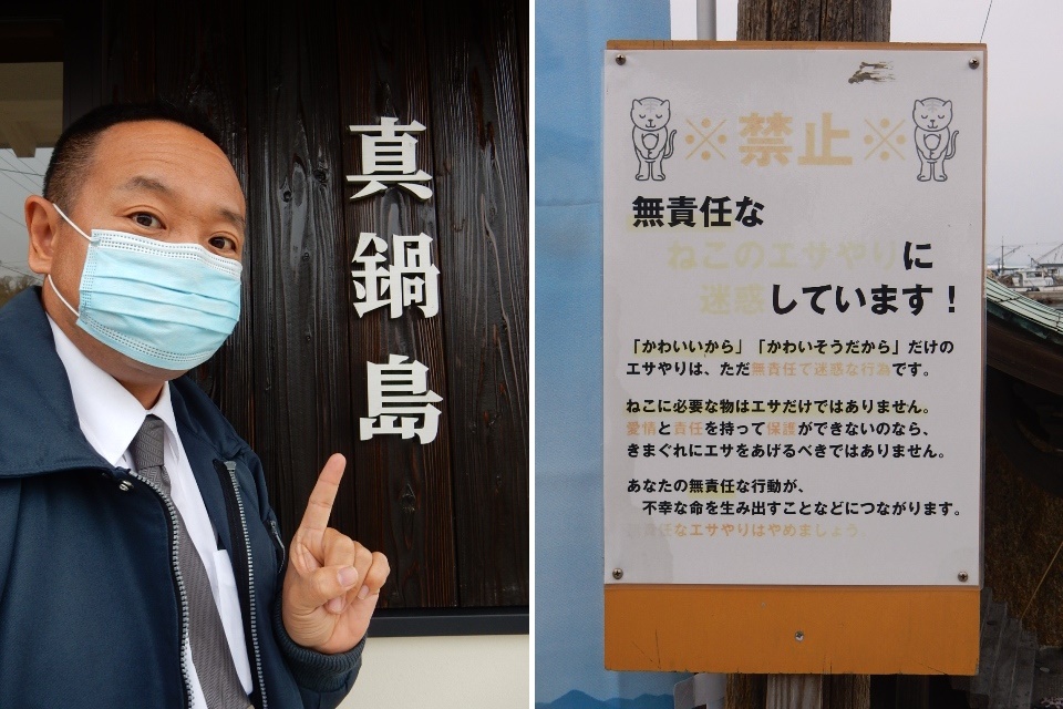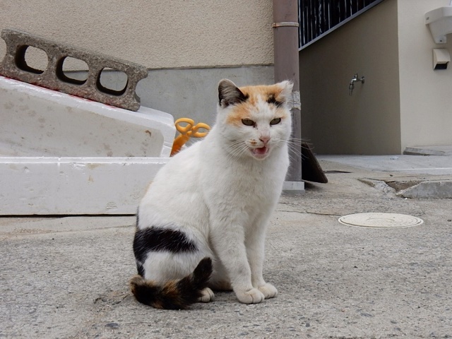 真鍋島で出会った初猫が上の三毛さんでした。人慣れしてるのか