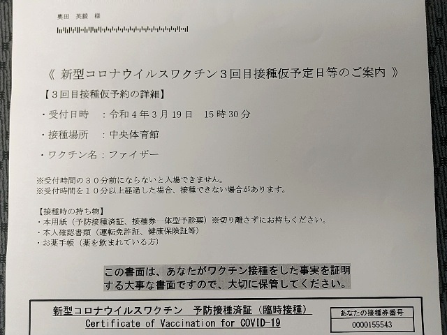 そして翌週、新型コロナウイルスのワクチン接種の3回目を