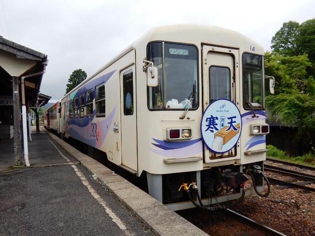 岩村駅で駅ノートを描いてる途中、「寒天列車」が着きました。