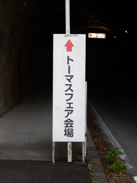 所から「トーマスフェア会場」の立て看板が出てました。