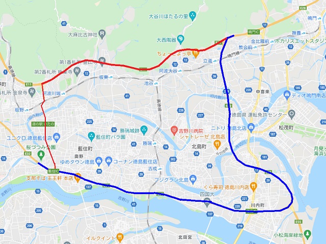 に入るルート(青)と、一旦高松自動車道に入って板野インターから