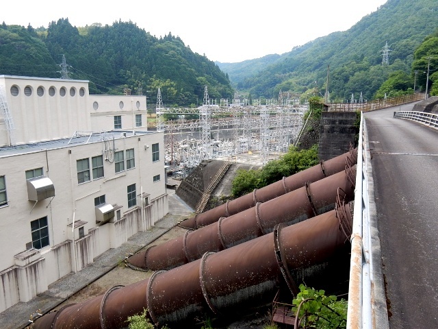 …手前の大きな鉄管が、駅の背後の山から水を通して発電機を回す