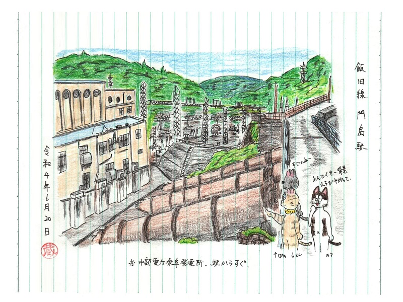 近くにある泰阜水力発電所を描いておきましょう。