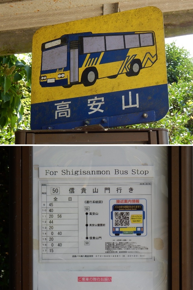 その廃線跡は道路となり、現在は近鉄の路線バスで朝護孫子寺