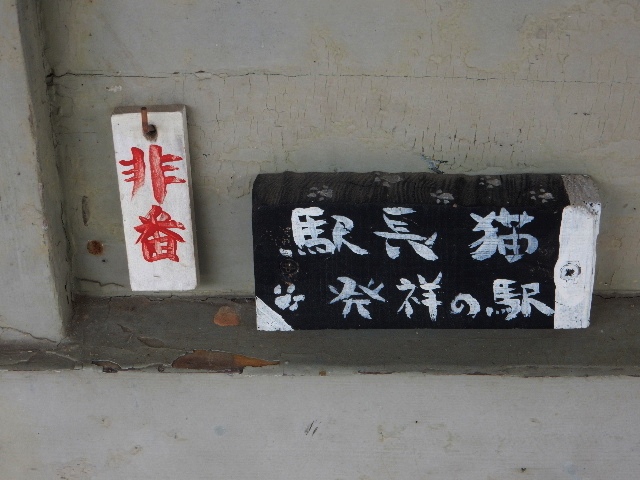 来る度にココで記念写真を撮ってる気がする柱の駅名票と、猫駅長