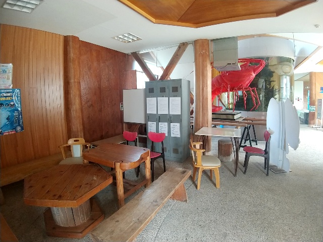 入口を入るとテーブルと椅子、ロッカーなどが置かれたフリースペース