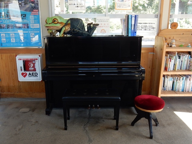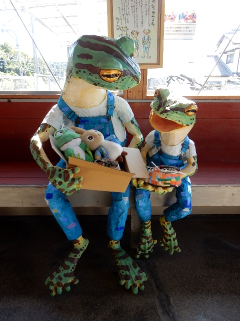 それに伴い駅舎内の待合室にはカエルのオブジェが飾られており、