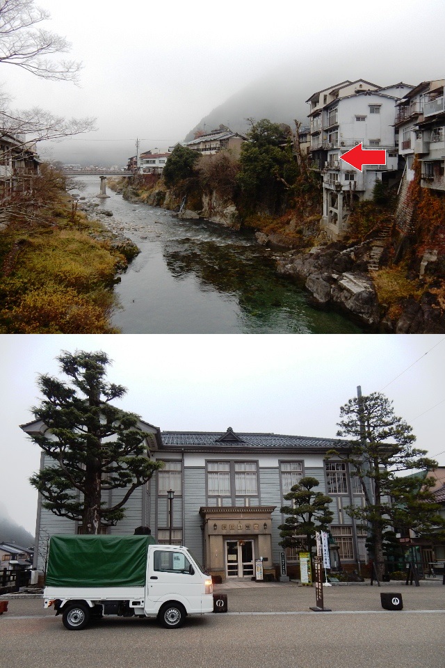 右上の画像の矢印の所が、前日に泊まった旅館の部屋です。