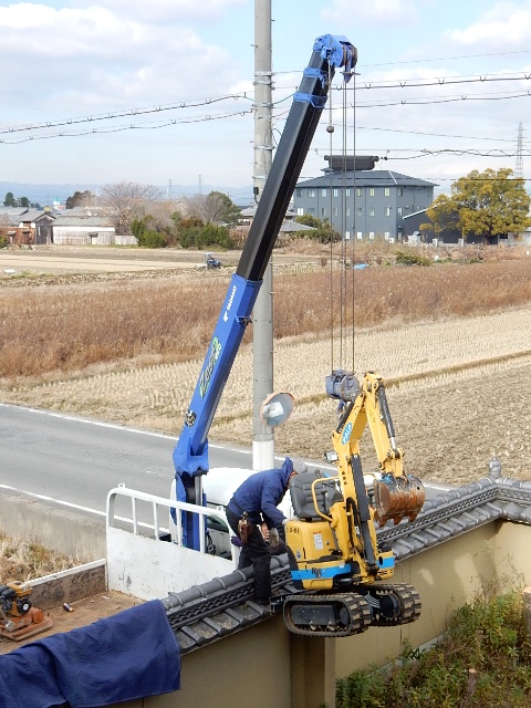 続いて小型のショベルカーを搬入します。クレーンで吊って壁越し