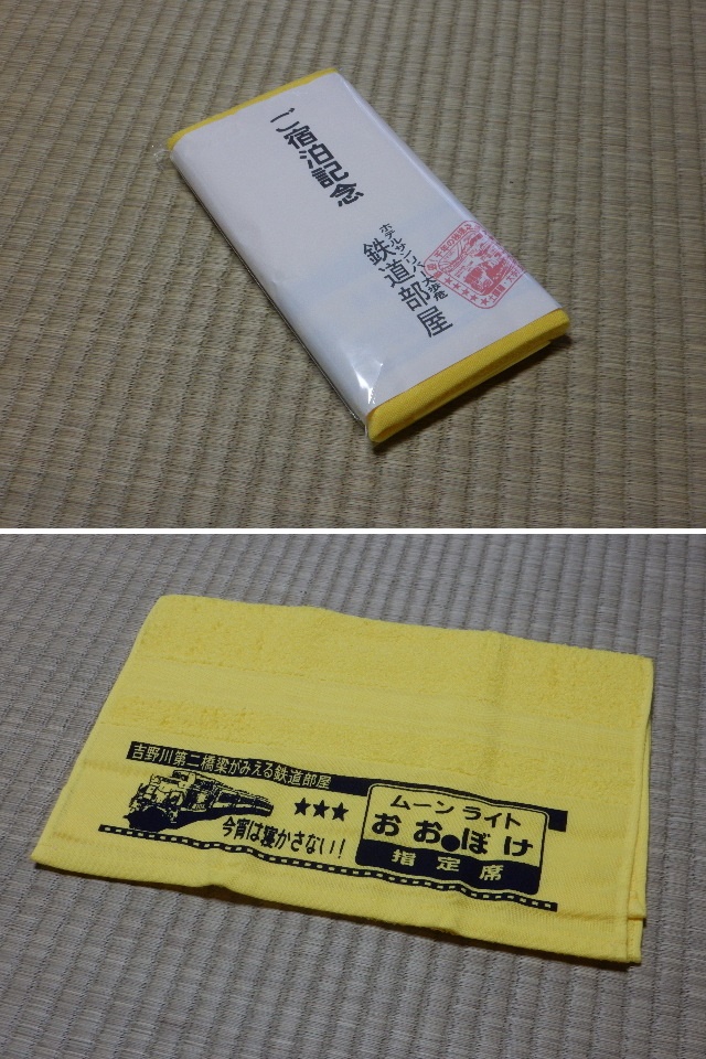 鉄道部屋の宿泊者には記念品として、オリジナルの黄色いタオルが
