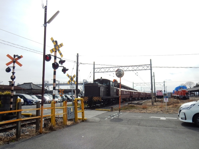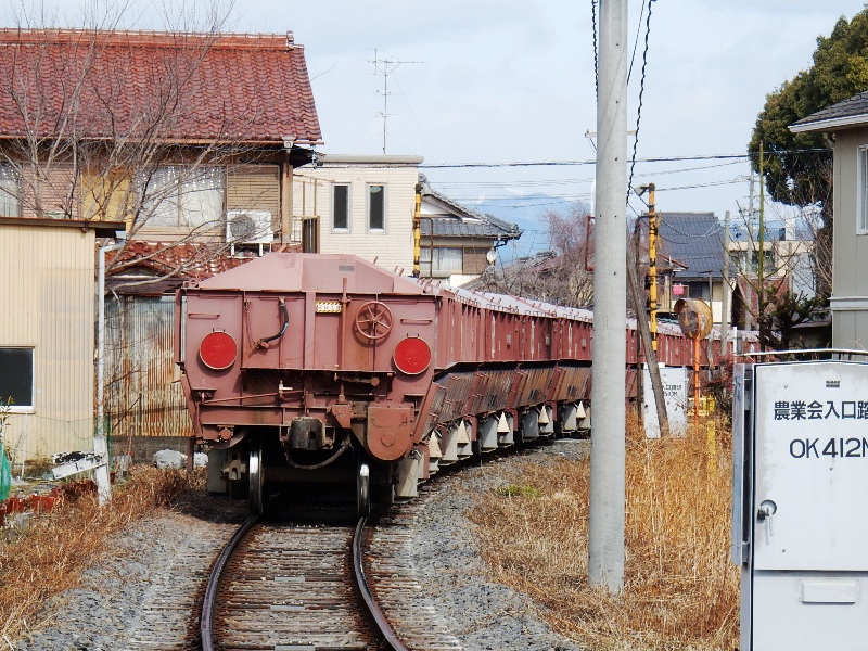 貨物列車は踏切を通って、奥の乙女坂駅へと向かいます。…石灰石