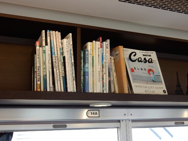 カウンター席の上に本棚があり、恐らくは瀬戸内地方の色々に因んだ