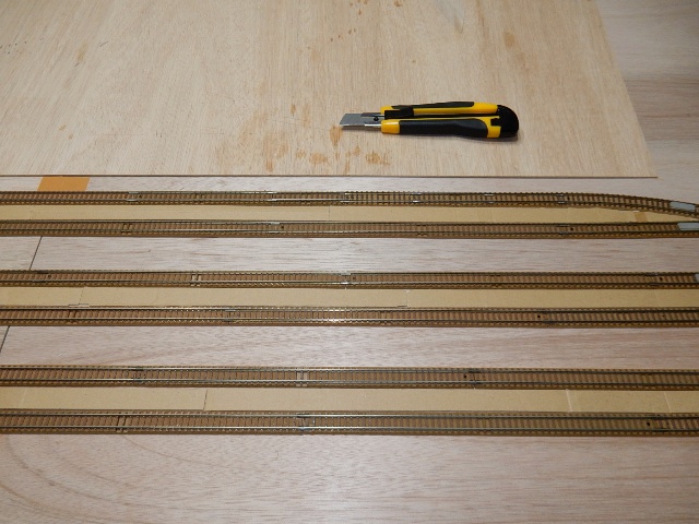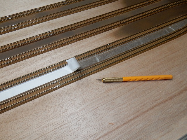まずは複線間隔で間が空く部分に薄めの段ボールを嵌め、高さを