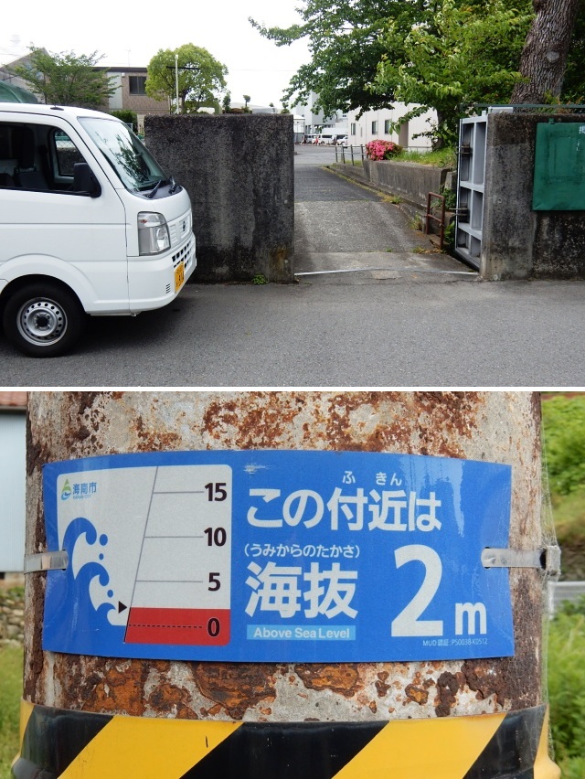 …この地点で海岸線から約130mの所です。海抜は2mなのか。