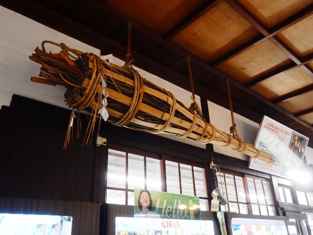 駅舎内には、鞍馬寺の火祭りで使われる大きな松明の見本が展示
