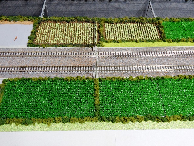 畑の部分は茶色のパウダーを撒いた上に、畝部分に緑色を重ねて
