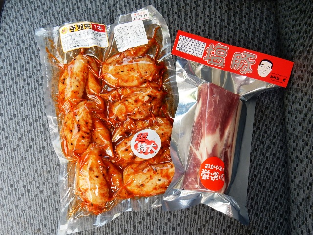 ついでの事に唐辛子風味の手羽先と塩豚のレトルトがあったので、
