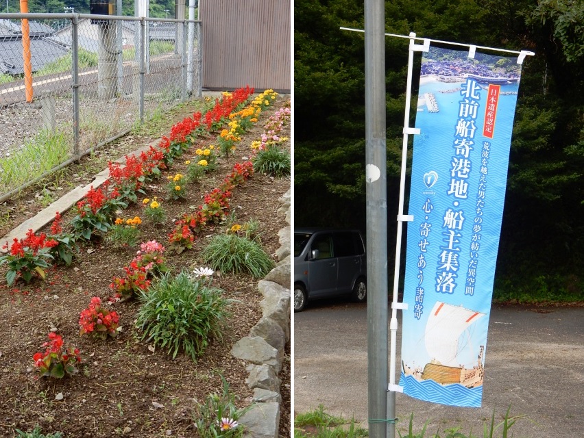 花壇と、新設されたであろう「北前船の寄港地」をPRする幟旗が