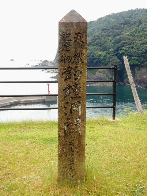 眼下に海が見えるホーム上に、「天然記念物/釣鐘洞門」と言う